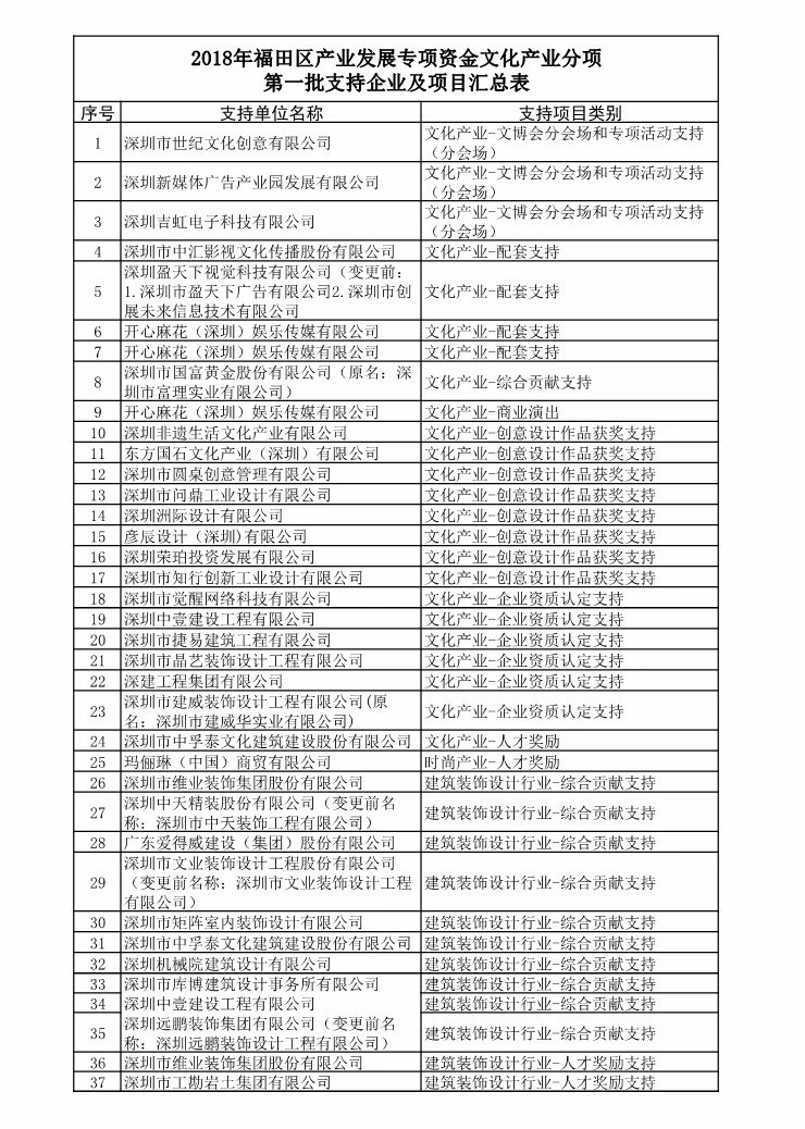 核心提示:2018年9月25日,福田企服中心公布了2018年福田區(qū)產(chǎn)業(yè)發(fā)展專項(xiàng)資金文化產(chǎn)業(yè)分項(xiàng)第一批支持企業(yè)及項(xiàng)目匯總表。其中,深圳中壹建設(shè)工程有限公司、深圳遠(yuǎn)鵬裝飾集團(tuán)有限公司、深圳東道建設(shè)集團(tuán)有限公司等建筑裝飾企業(yè)獲得該項(xiàng)專項(xiàng)資金支持。支持項(xiàng)目類別有建筑裝飾設(shè)計(jì)行業(yè)——綜合貢獻(xiàn)支持、人才獎(jiǎng)勵(lì)支持、創(chuàng)意設(shè)計(jì)作品獲獎(jiǎng)支持、企業(yè)資質(zhì)認(rèn)定支持。