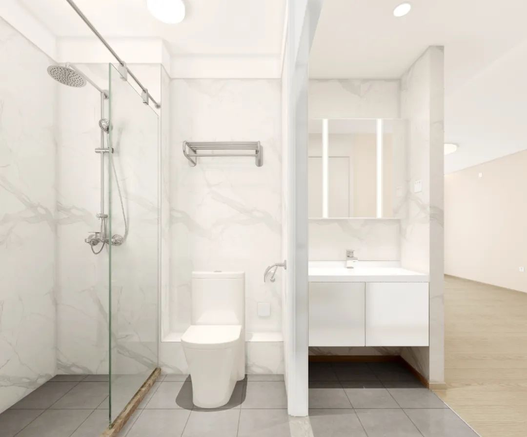 項(xiàng)目墻面采用自飾面硅酸鈣板,環(huán)保方面達(dá)到了E1級(jí)甲醛釋放標(biāo)準(zhǔn)。廚衛(wèi)間墻板采取UV噴涂打印工藝,具有良好的防水、耐潮性能。室內(nèi)機(jī)電采取管線分離、同層排水、干濕分區(qū)形式,有效避免了滲漏隱患,同時(shí)減少噪聲干擾。