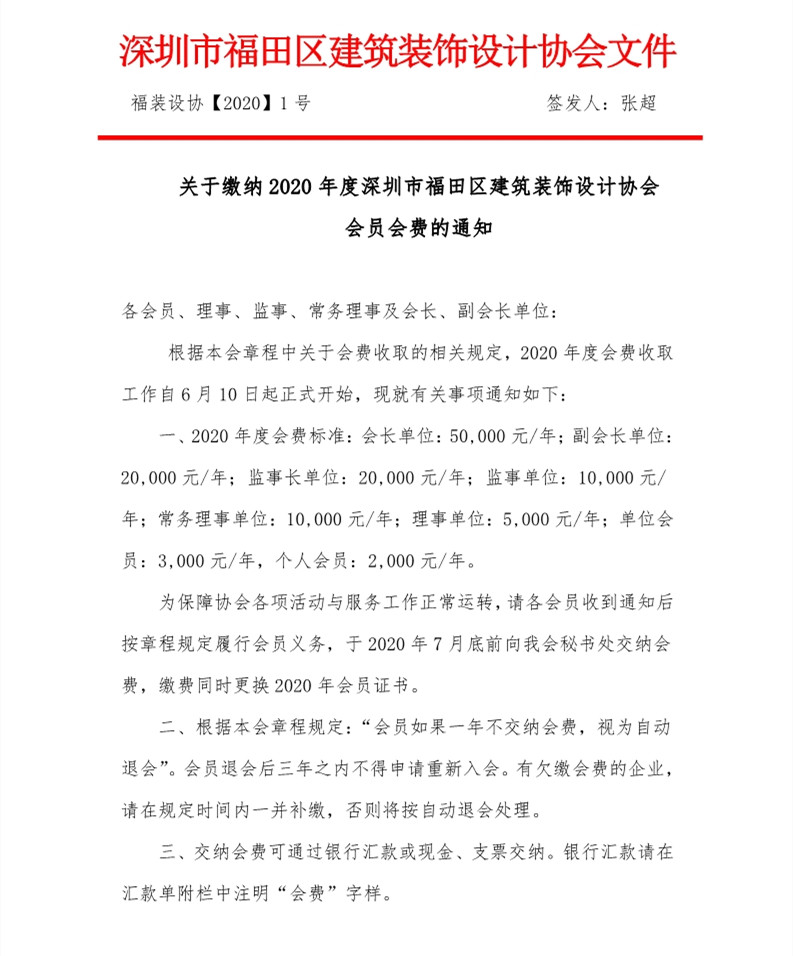 關(guān)于繳納2020年度深圳市福田區(qū)建筑裝飾設(shè)計(jì)協(xié)會(huì)會(huì)員會(huì)費(fèi)的通知