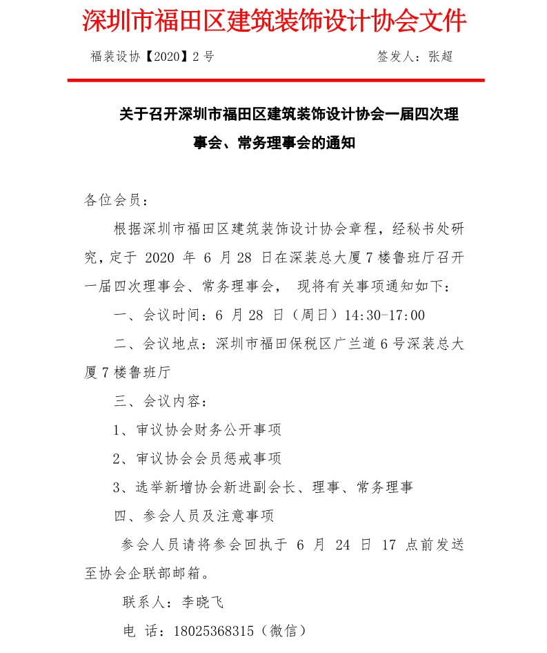 關于召開深圳市福田區(qū)建筑裝飾設計協(xié)會一屆四次理事會、常務理事會的通知