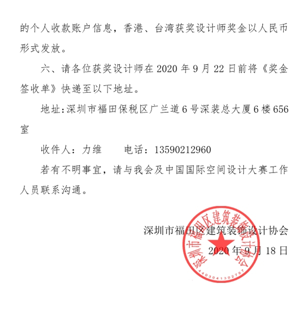 關于第十屆中國國際空間設計大賽十大杰出建筑裝飾設計師、十佳家裝設計師獎金發放流程的說明