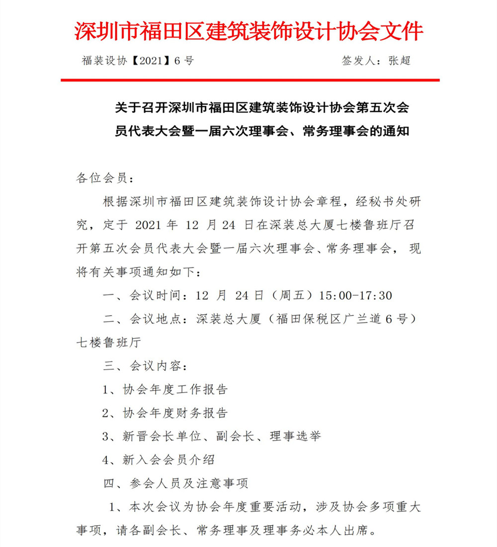 關(guān)于召開(kāi)深圳市福田區(qū)建筑裝飾設(shè)計(jì)協(xié)會(huì)第五次會(huì)員代表大會(huì)暨一屆六次理事會(huì)、常務(wù)理事會(huì)的通知